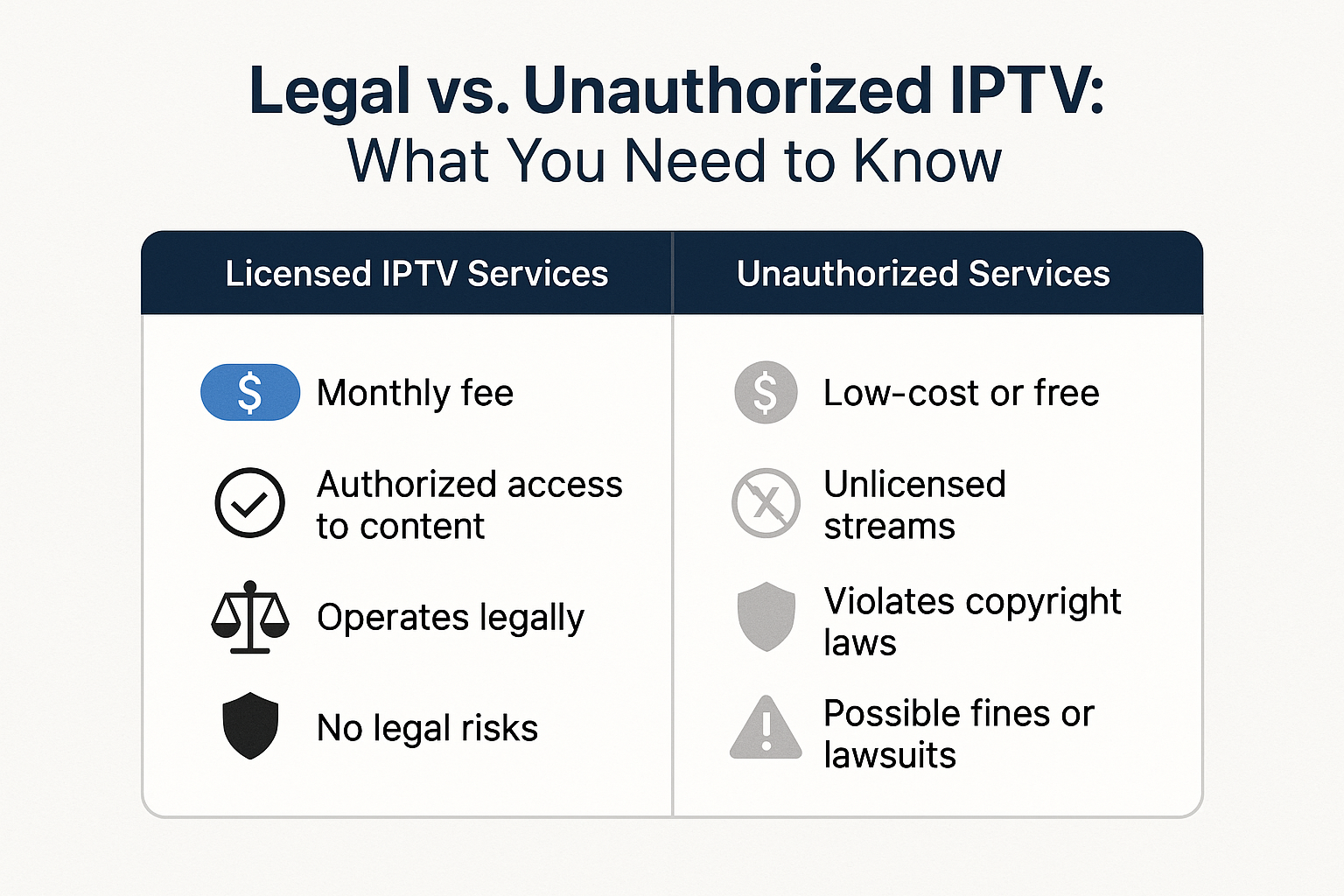 | Licensed IPTV services | Legitimate services with proper content rights | $25-70/month | Fully legal |